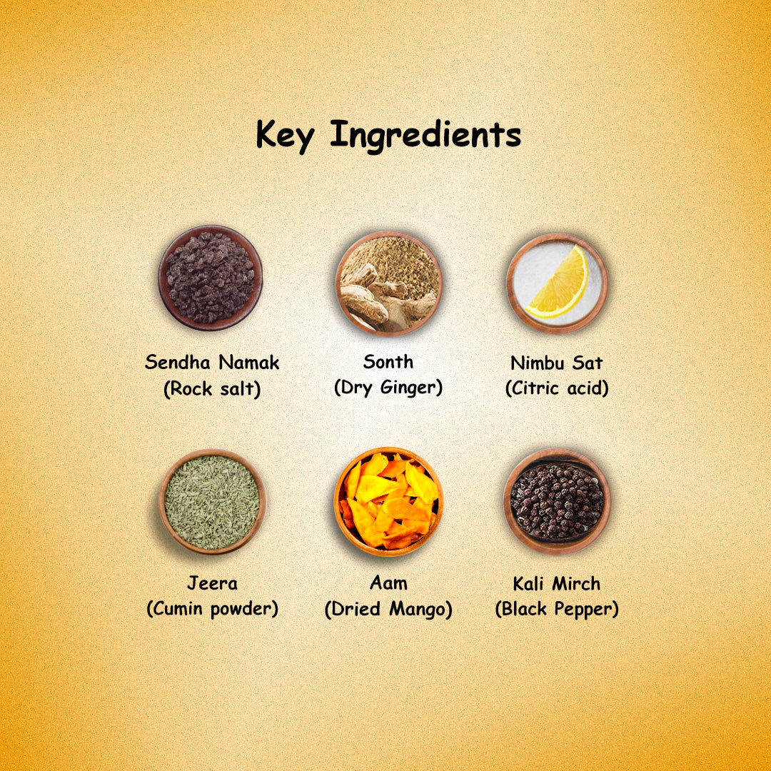 Aam Papad, Ajwain, Amchur, White Salt, Dhaniya, Black Salt, Citric Acid, Kali Mirch, Jeera, Rock Salt, Sonth, Pipal, Sugar