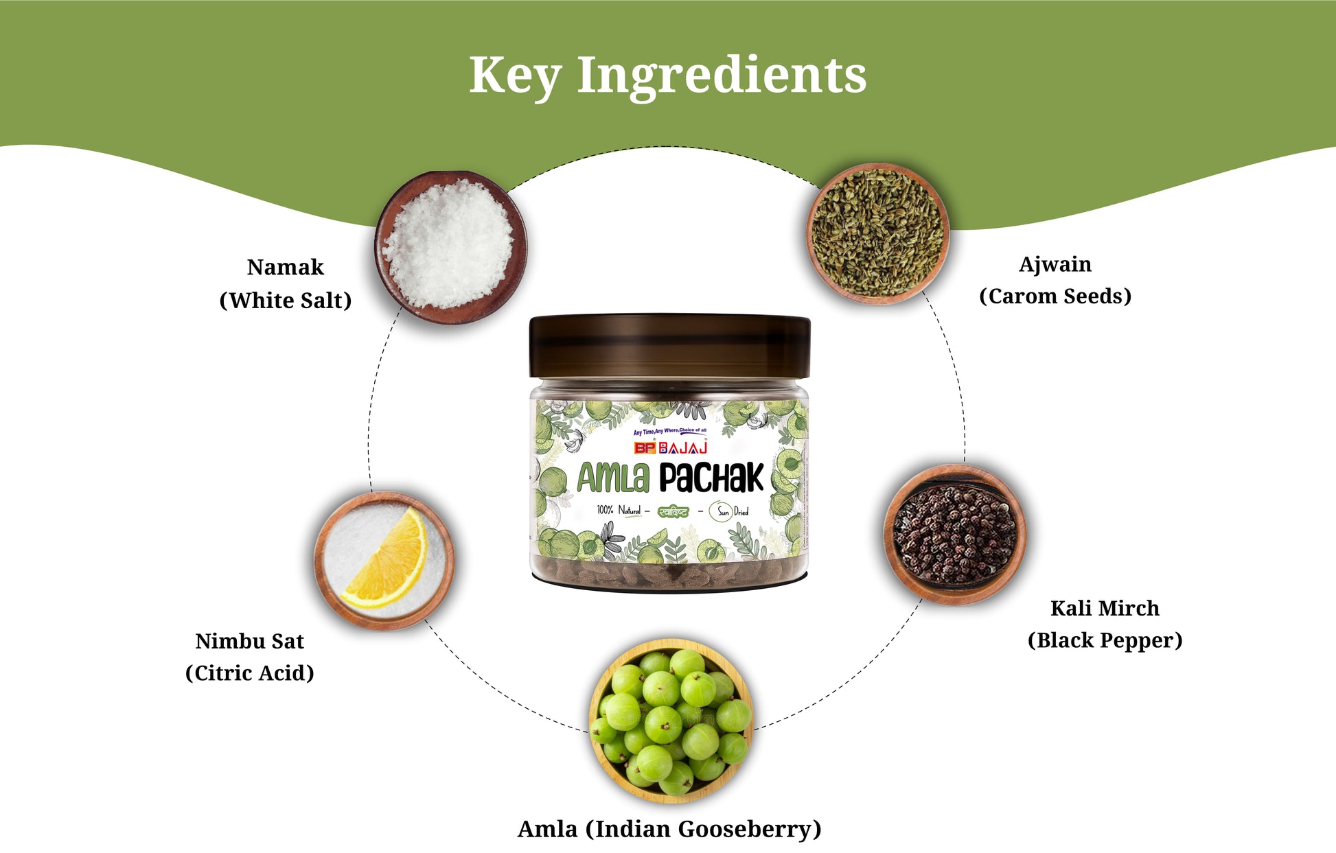 Amla, Black Salt, White Salt, Ajwayan, Citric Acid, Kali Mirch, Piplamul, Pipal, Excipients Q.S.