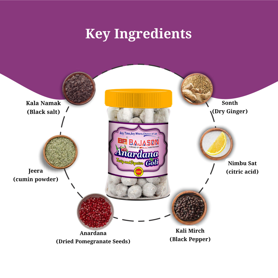 1. Digestive Support: Anardana Goli aids in digestion, reduces acidity, and helps alleviate symptoms of indigestion and bloating.