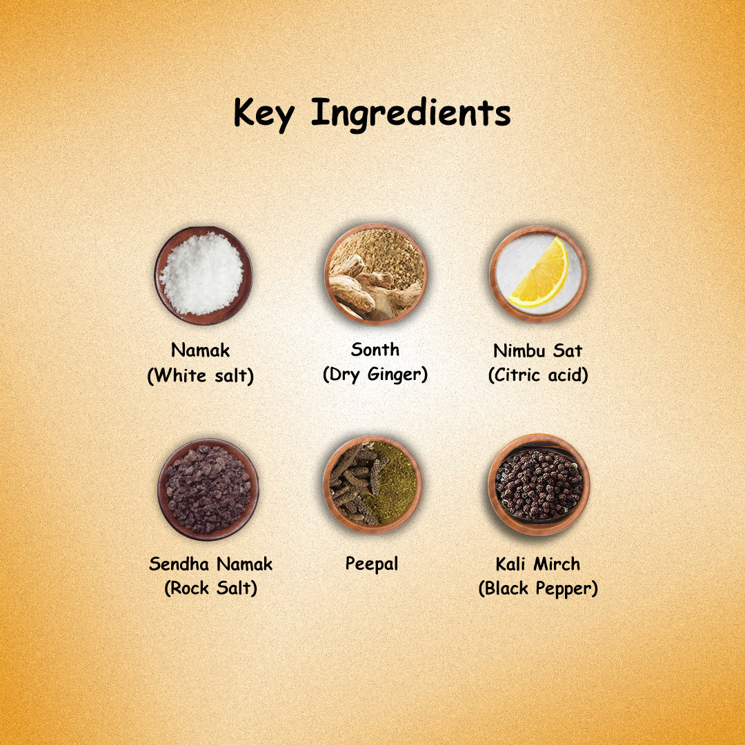 Kali Mirch, Sonth, Pipal, Sugar, White Salt, Black Salt, Jeera, Citric Acid, Excipients Q.S.