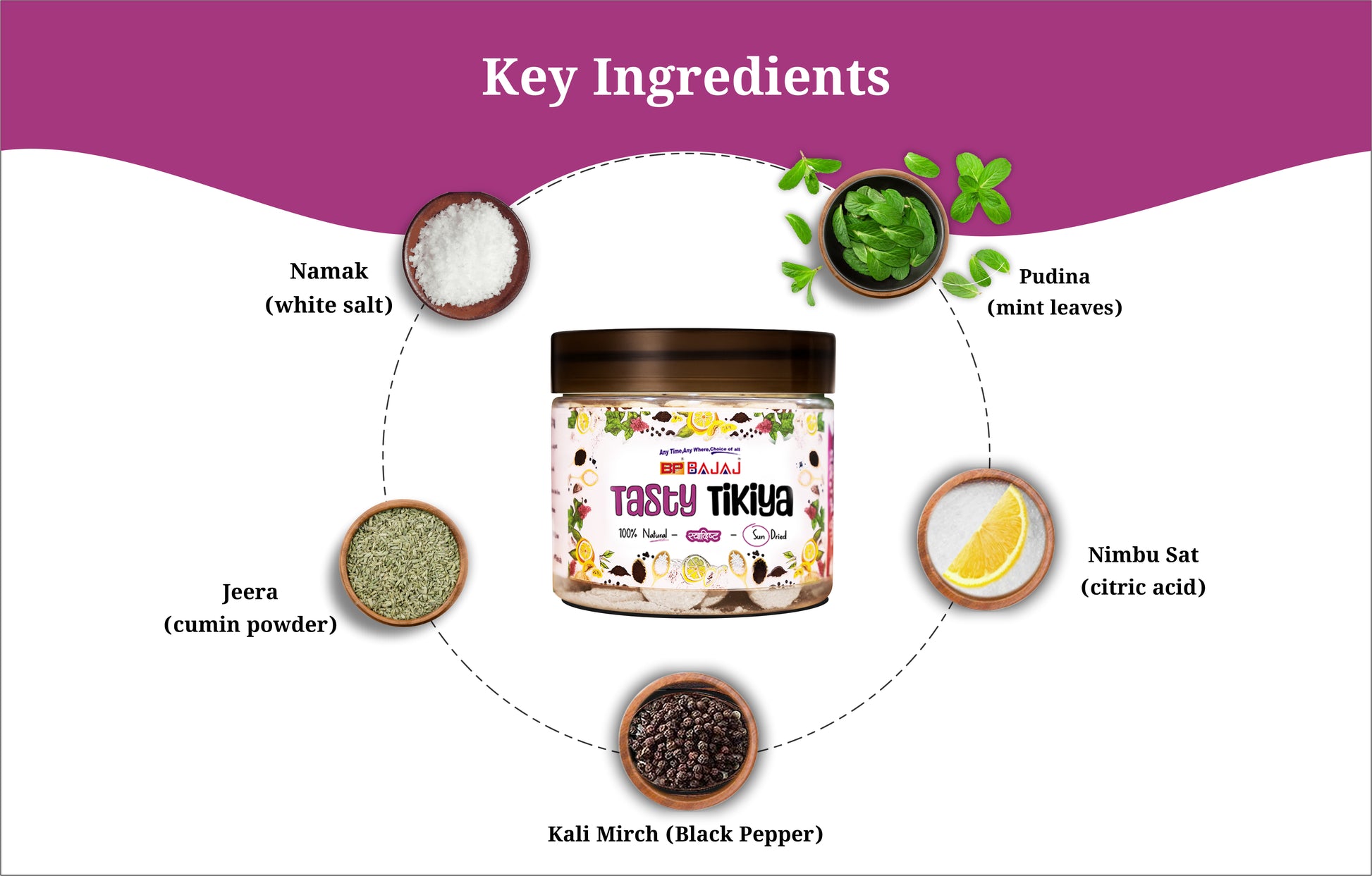 Kali Mirch, Pipal, Sugar, White Salt, Black Salt, Jeera, Citric Acid, Nav Saadar, Pudina, Amchur, Saunf, Sonth, Excipients Q.S
