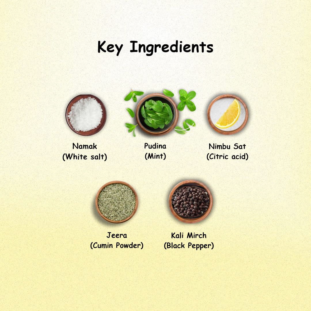 Kali Mirch, Pipal, Sugar, White Salt, Black Salt, Jeera, Citric Acid, Nav Saadar, Pudina, Amchur, Saunf, Sonth, Excipients Q.S
