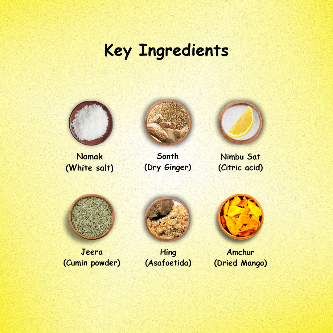 Kali Mirch, Dhaniya, Hingbhuna, Harad, Sonth, Jeera, Ajwain, Pipal, Dry Mango, Excipients Q.S